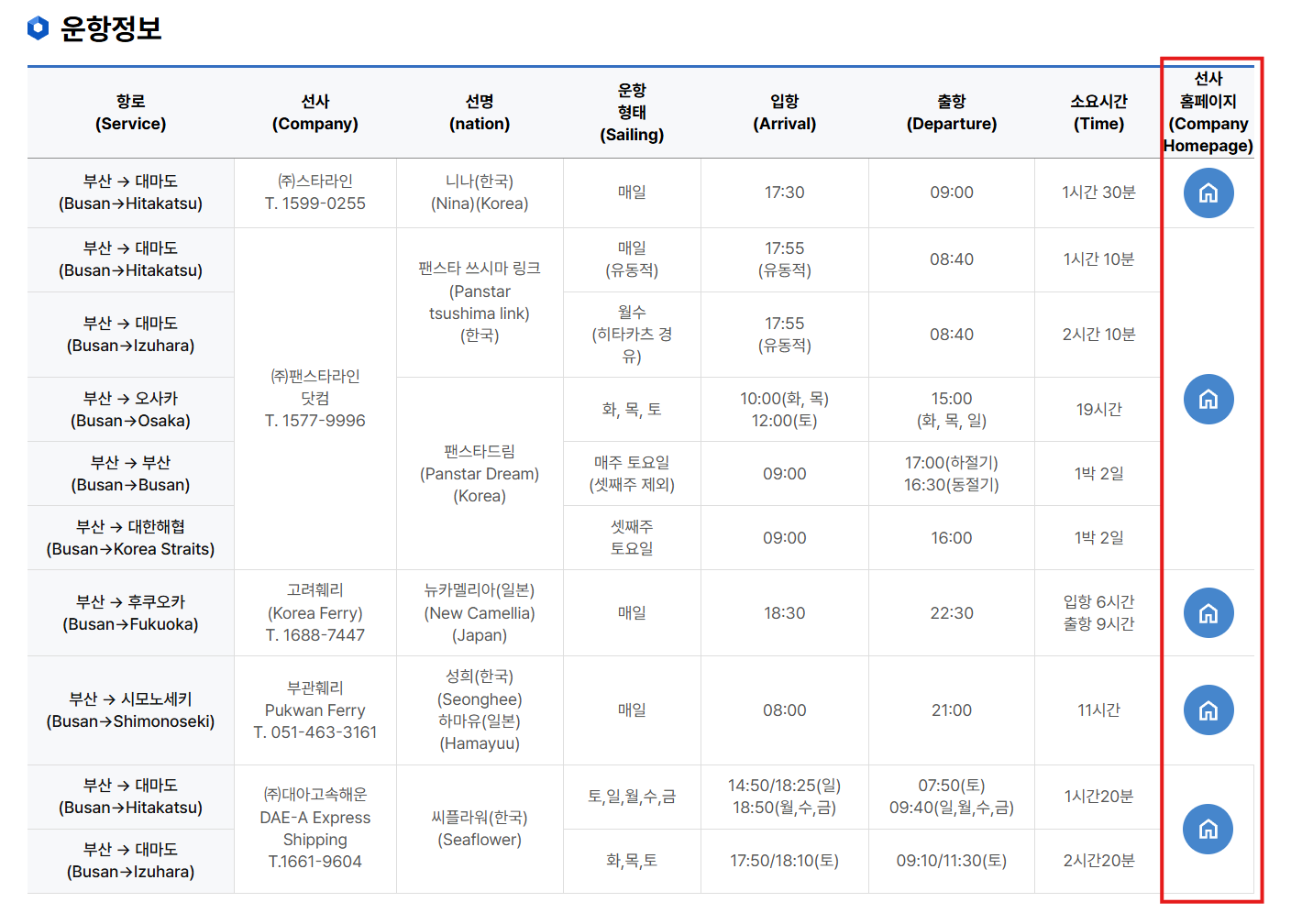 - 예약 채널: 대아고속해운, 부산항 공식 홈페이지